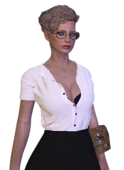 Комплект одежды для офиса, включающий чистую версию (белая блузка и черная юбка), а также версию с цветовыми вариациями (красная, синяя и чёрная блузки), плюс рваную версию, для которой доступен вариант только с белой блузкой и черной юбкой.