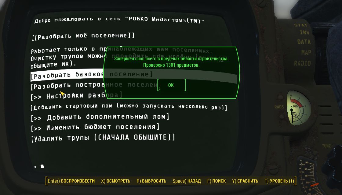 Особое примечание: Мод настроен на удаление ванильных объектов, но вы также можете попробовать опцию «Разобрать построенное поселение (ЭКСПЕРИМЕНТАЛЬНО)».